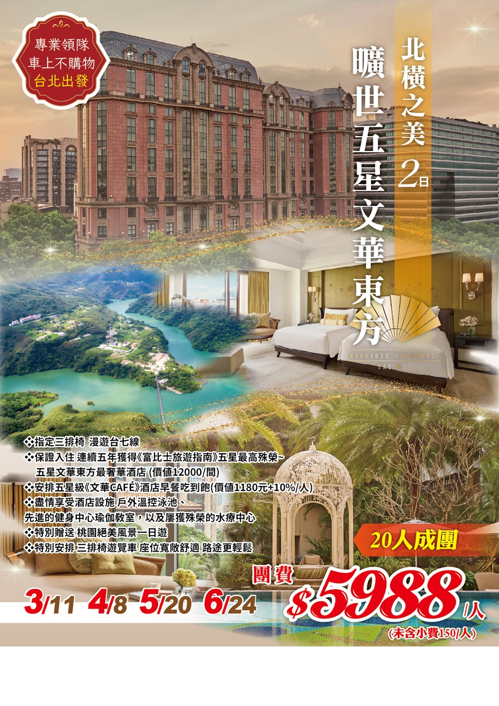 • 遊覽車車資,飯店早餐,全程住宿2人1室,250萬旅遊責任險+20萬意外醫療險