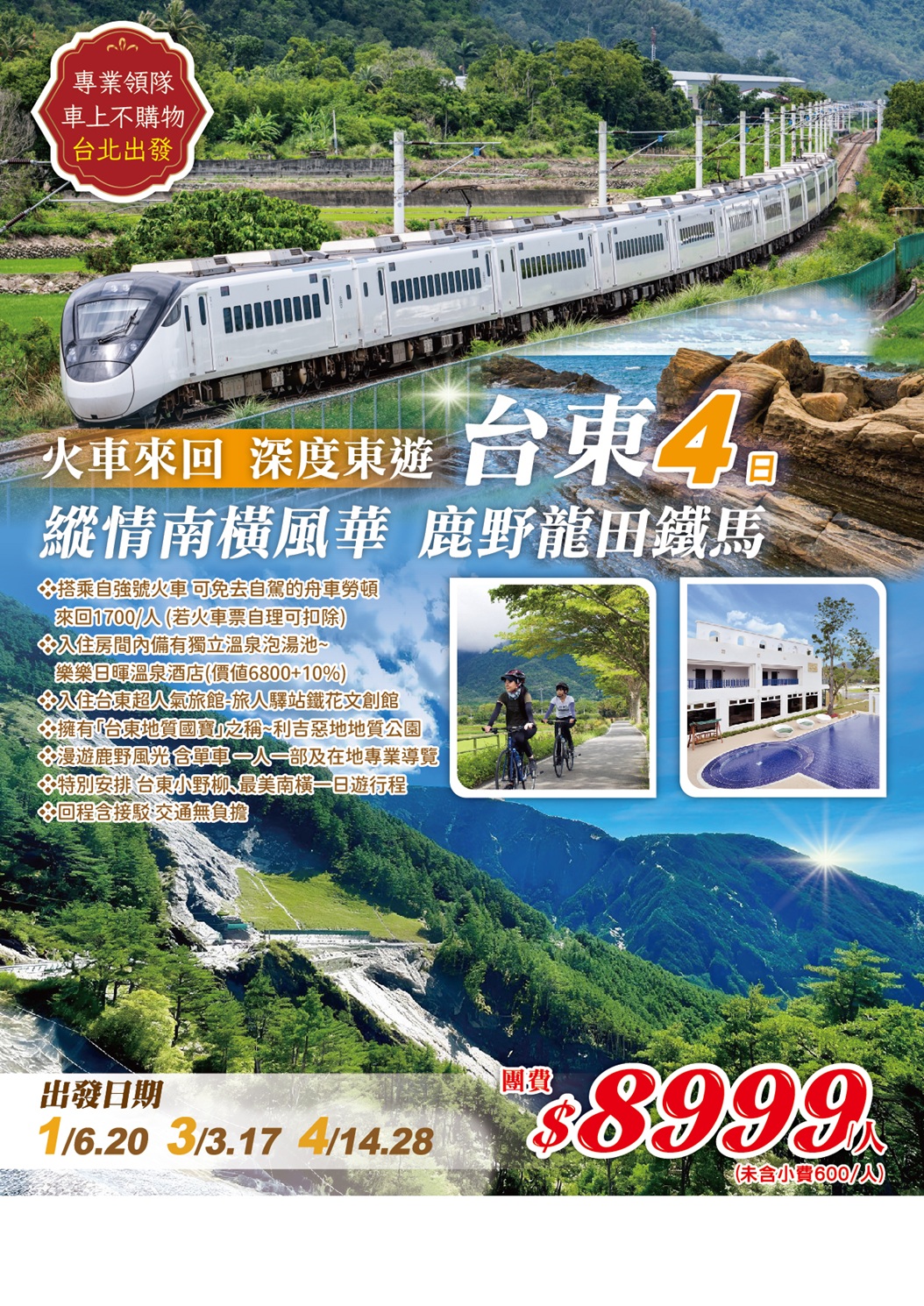 • 遊覽車車資,門票,午餐,來回火車票,住宿費用,飯店早餐,全程住宿2人1室,250萬旅遊責任險+20萬意外醫療險