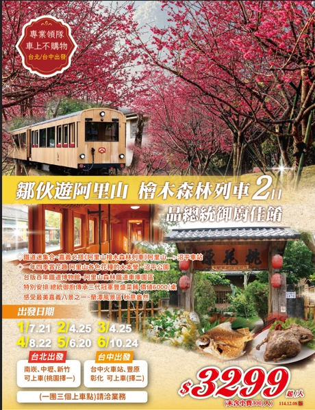 台中出發~鄒伙遊阿里山 檜木森林列車 品總統御廚佳餚 二日